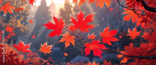 cartoon Vibrant red maple leaves with soft morning sunlight anime illustration art design