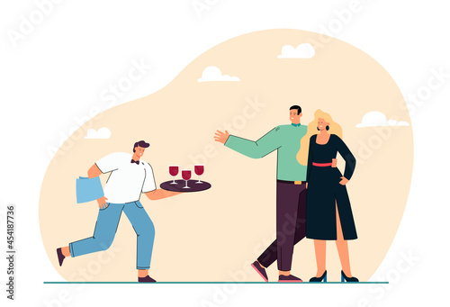 Cartoon waiter offering wine to couple in formal clothes. Staff serving man and woman on social event flat vector illustration. Restaurant service, celebration concept for banner or landing web page