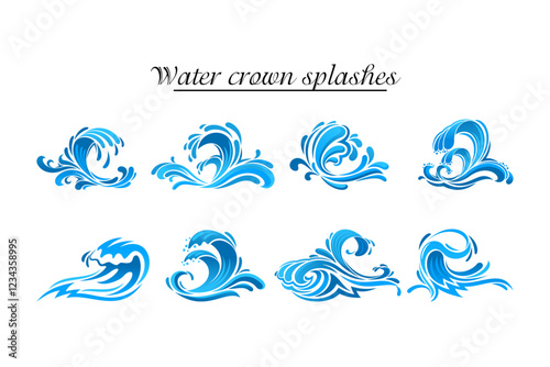 Cartoon water splash effects depict fluid dynamic splashing, droplets and ripples in motion. Isolated vector set of liquid splatters, aqua or water splashes and swirls for animation and visual effects