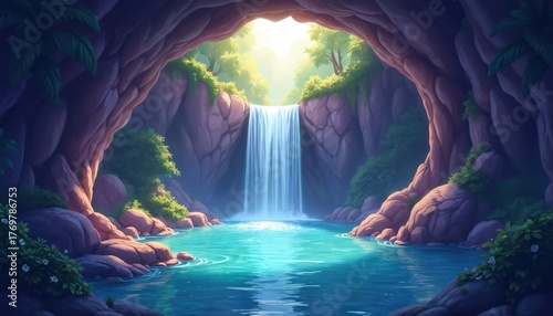 Cartoon waterfall cascades into clear blue pool within lush green cave. Sunlight streams from opening illuminating jungle rocks and water. Serene natural oasis.