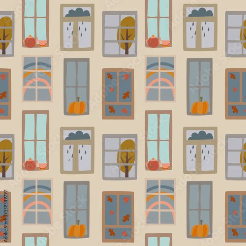 cartoon window seamless pattern, diffrenet windows repeat print, autumn window endless background, Cartoon building illustration