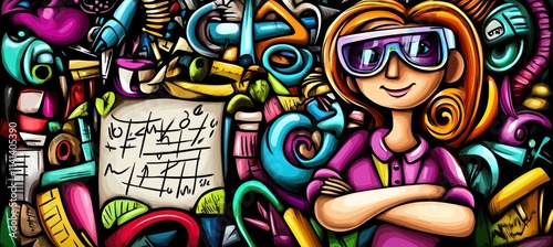 Cartoon woman with goggles, surrounded by colorful scribbles.