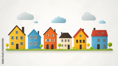 Cartoonish Homes Array Illustration Depicting Community and Building Diversity in a Suburbia Neighborhood and Blue Sky