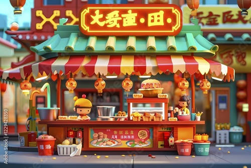 Cartoon-style Chinese street market booth bustling with charming animated characters, street food, AI generated