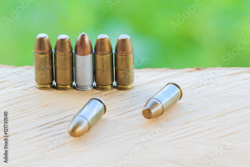 cartridge on the wooden floor and green wall Background.