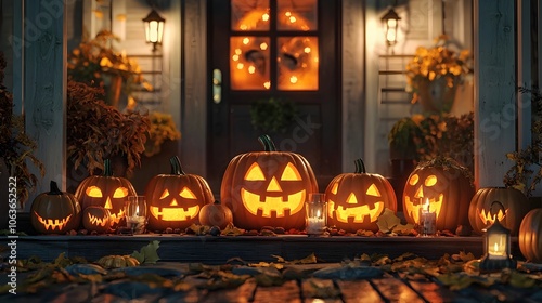 Carved Pumpkins with Glowing Candles Arranged on Porch Creating Festive Halloween Display