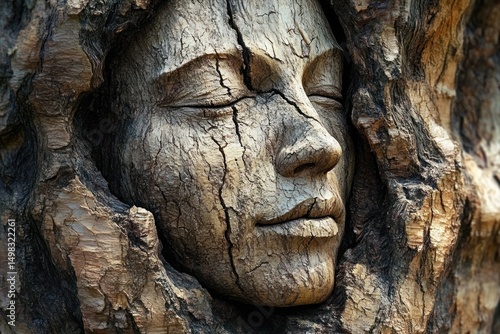Carved wooden face with closed eyes emerging from rough tree bark, showing detailed cracks and textures expressing calm and serenity