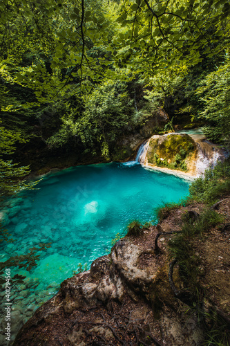 Cascade near pond with pure rippled water surrounded by colorful trees on mount in woods