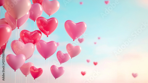 cascade of floating heart shaped balloons in various shades of pink against soft blue sky creates whimsical and romantic atmosphere