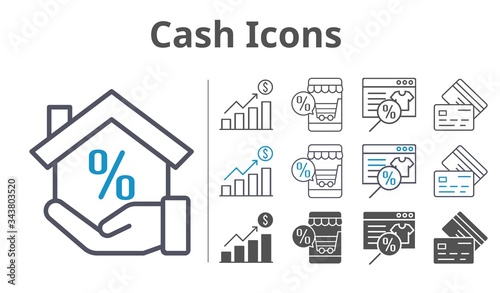 cash icons icon set included profits, online shop, mortgage, credit card icons