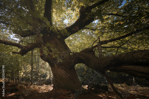 Castaño centenario en el bosque encantado de castaños durante el otoño.