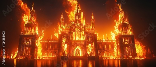 Castle engulfed in flames at night creating a dramatic and intense atmosphere