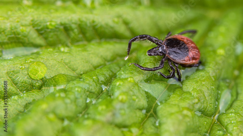 Castor bean tick on wet green leaf with water drops. Ixodes ricinus. Movement of a parasitic mite in raindrops. Transmit of tick-borne diseases as Lyme borreliosis or encephalitis. Health protection.
