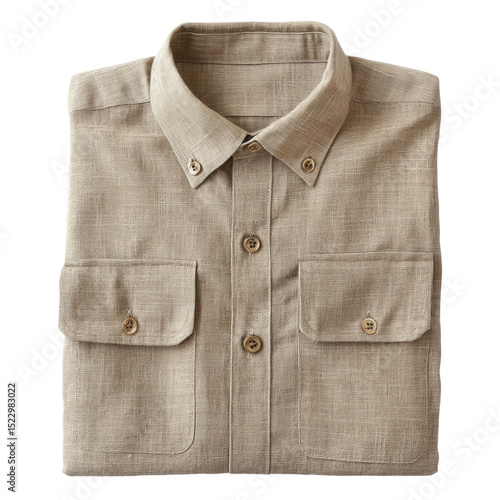 Casual beige linen shirt with two front pockets and button closure, cutout PNG, transparent background, cutout PNG