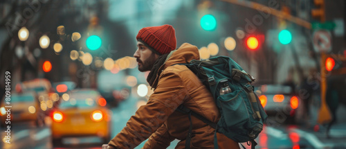 Casual biker waiting at a pedestrian crossing in the city, dressed for work and surrounded by bike lanes and green lights.