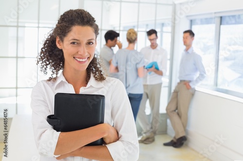 Casual businesswoman smiling at camera holding diary