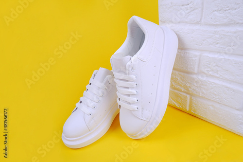 Casual comfortable white shoes.Stylish women's shoes on a high platform with laces on a yellow background and a brick wall. Seasonal sales, promotions, discounts on shoes. Proper care for white skin.