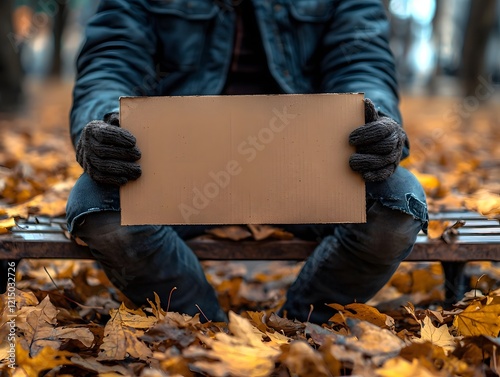 Casual Person Sitting on Park Bench Holding Blank Cardboard Sign in Autumn Leaves