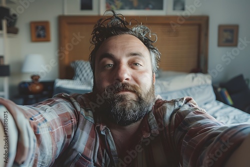 Casual Selfie of a Bearded Man in a Cozy Bedroom Setting