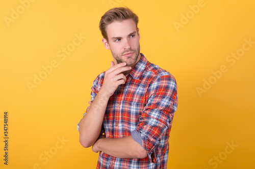 Casual style. Masculinity concept. Man beauty model. Interesting idea on his mind. Menswear shop. Macho man wearing checkered shirt. Fashion summer trends. Unshaven man skin care. Barbershop concept