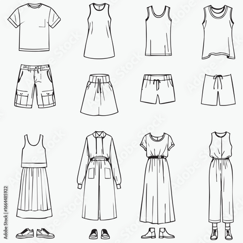 Casual women’s fashion silhouette set — black line vector icons of tops, shorts, dresses, and jumpsuits for style and design