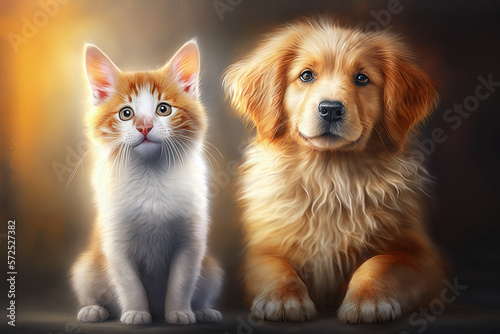 Cat And Dog . Puppy And Kitten . AI generated Illustration.