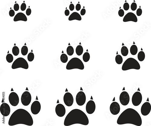 Cat and Dog Paw Print Icons for Pet Logo Design | Black Paw Print Clipart Set for Animal Themes | Clean Pet Paw Icons for Vet and Pet Shop Branding | Cat and Dog Footprint Silhouettes for Creative Use