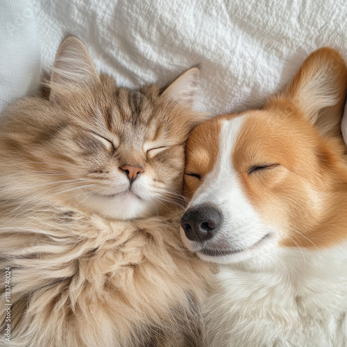 cat and dog peacefully sleeping together, showcasing their bond and warmth