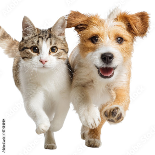 Cat and dog running side by side, playful friendship moment, white background --v 7.0