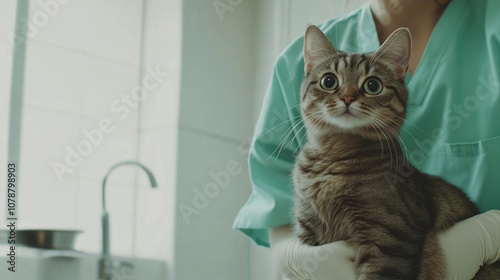 Cat calmly lying on veterinary examination table, trusting environment for health check. Animal care and trust in medical professionals.