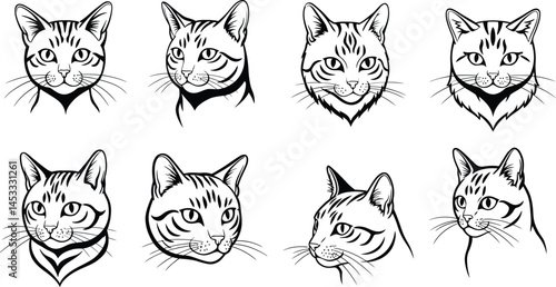 Cat heads with various expressions and angles in black and white line art style vector illustration