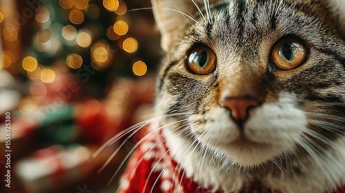 Cat in Santa Claus costume with Christmas tree and presents. A festive scene featuring a playful cat dressed as Santa