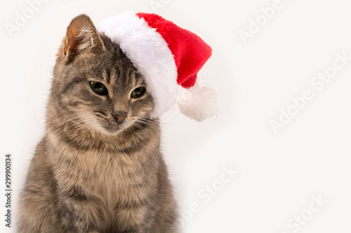 Cat in Santa's hat close-up. New Year, Christmas cat on a white isolated background, for postcard, banner. Front view, place for text, Copy space.