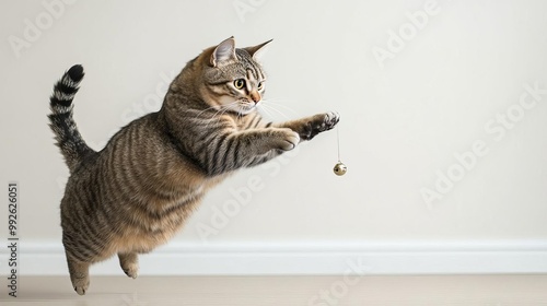 Cat leaping gracefully in mid-air, chasing a dangling string, dynamic movement, energetic, lively