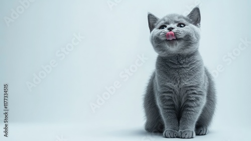 Cat licking its lips while sitting calmly on a minimal white studio background, highlighting its sleek fur and playful demeanor.