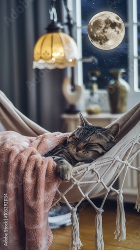 Cat resting in hammock with light collar and bell, indoor setting with nighttime lighting