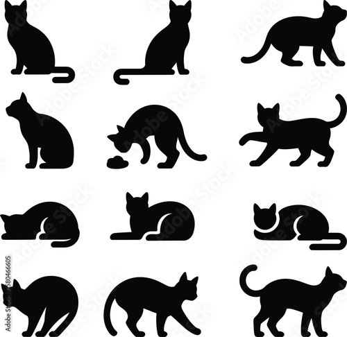 Cat silhouette vector icons with different poses for pet, animal, and playful cartoon design elements