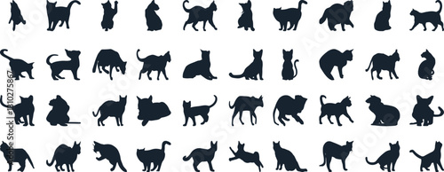 Cat Silhouettes Vector Illustration, perfect for Halloween, cat lovers. Features various cat poses, paw prints. Ideal for pet, animal, feline, domestic, house cat