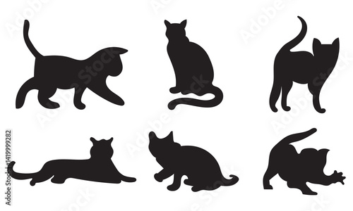 Cat Silhouettes Vector Illustration, perfect for Halloween, cat lovers. Features various cat poses, paw prints. Ideal for pet, animal, feline, domestic, house cat themes