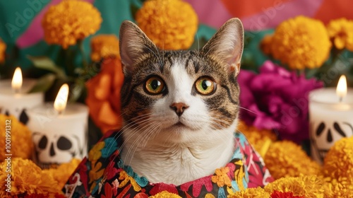 Cat wearing a colorful papel picado cape, surrounded by marigolds and candles on a Day of the Dead altar