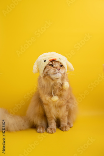 Cat Wearing Adorable Hat with Vibrant Yellow Background