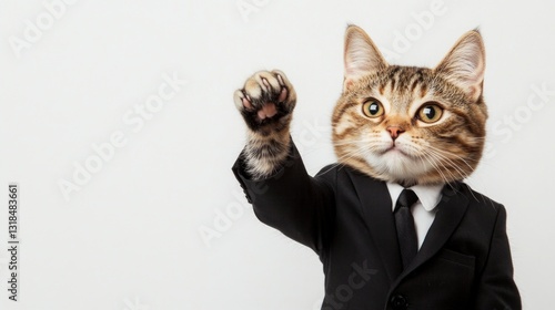 Cat Wearing Suit and Tie Raising Paw in Business Environment