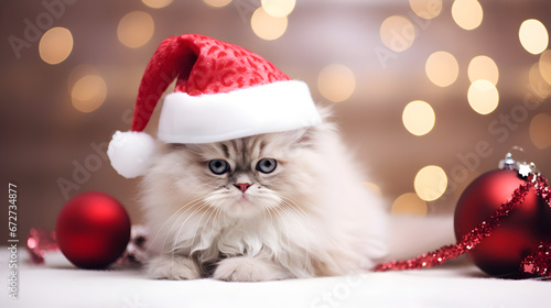 cat with christmas hat, kitten in a santa hat on a Pastel Background - Whimsical Holiday Scene