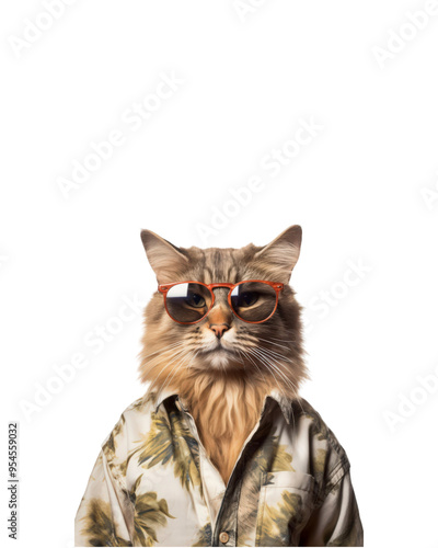 Cat with sunglasses and a tropical shirt, sitting in a cool pose. Suitable for summer backgrounds, pet products, or tropical themes