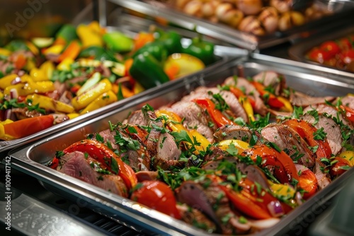 Catering hotel line buffet indoors food meat.