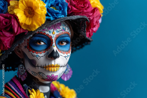 Catrina female with blue eyeshadow and floral crown in traditional clothing on vibrant background for Day of the Dead