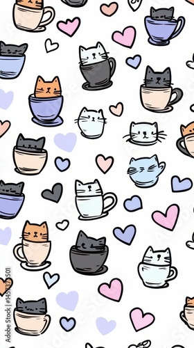 Cats in mugs, hearts, cute pattern.
