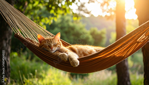 Cat's Lazy Siesta in Hammock: A ginger cat peacefully rests in a cozy hammock, bathed in the soft glow of the setting sun. Serenity and relaxation in an idyllic outdoor setting.