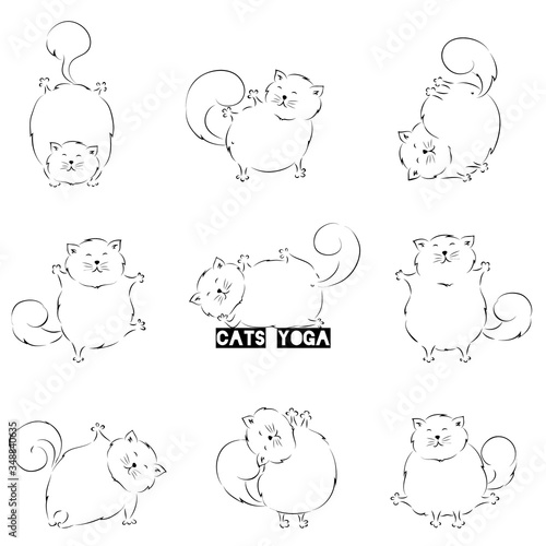 Cats yoga icon set. Cute cats doing yoga poses. Vector illustration isolated on white background.