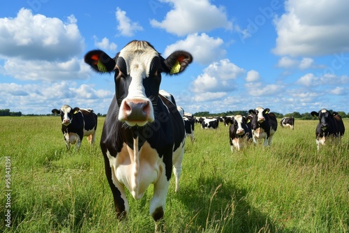 Cattle graze in a beautiful sunny pasture under clear blue skies with soft clouds. Flock of cows